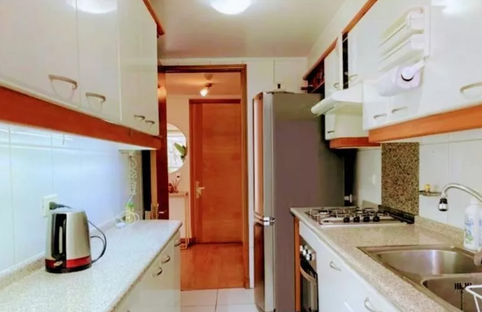 Hall de acceso, living-comedor con salida a la terraza, cocina separada de muy buen porte, equipada con cubiertas de granito, encimera, horno, bastante luminosa. Loggia donde cabe cómodamente lavadora y secadora.